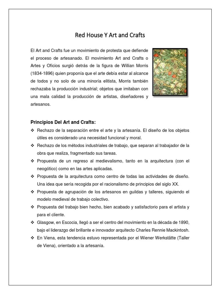 · propuesta de regreso al medievalismo, tanto en arquitectura (con el neogótico) como en las artes aplicadas... Aunque los estudiantes de arte, arquitectura y diseño victoriano se atreven debatir confiadamente las fuentes, la importancia y la influencia del movimiento arts and crafts (literalmente, «artes y oficios»), rara vez llegan a ponerse de acuerdo sobre qué era o quién pertenecía exactamente a este movimiento. · crítica la producción industrial (reprocha la fabricación en serie y falta de diferenciación). La arquitectura art and crafts marcó un camino para la evolución de la arquitectura moderna, utilizar formas simples y tradicionales y dejar al descubierto el material. Dec 07, 2012 · entre las ideas más características del arts and crafts se encuentran principios filosóficos, éticos y políticos, tanto como estéticos. El diseño de los objetos útiles es considerado una necesidad funcional y moral. El movimiento arts and crafts es un movimiento de finales del siglo xix y principios del xx, dirigido por artistas que querían revitalizar las artes decorativas volviendo a los …